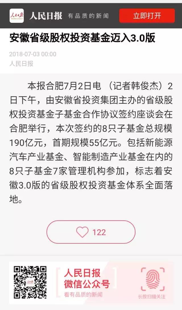 7月3日的《人民日报》第10版刊发题为《安徽省级股权投资基金迈入3.0版》的新闻报道,这是省高新投公司工作第一次登上人民日报。